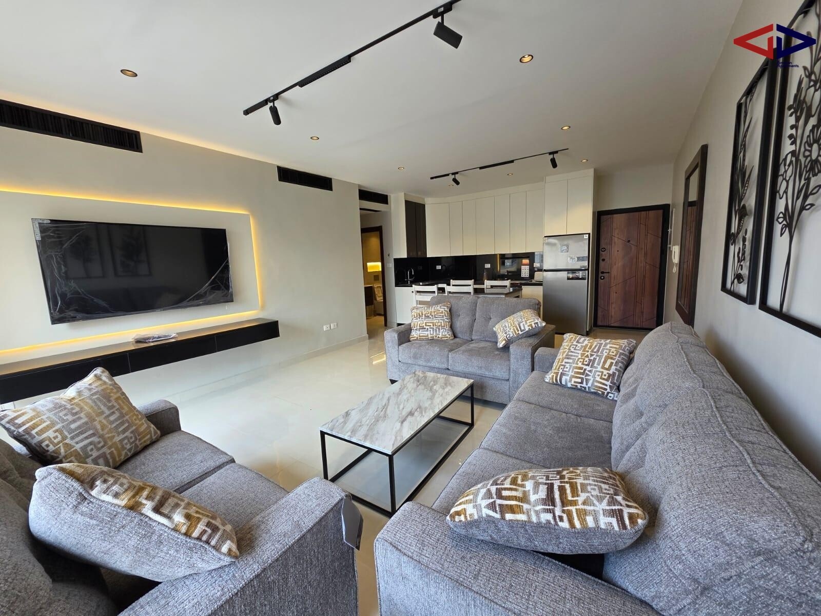 The apartment features a bright and well-organized layout with a welcoming living area connected to a stylish open-plan kitchen, creating a modern and functional space for everyday living and entertaining. Large windows allow plenty of natural light to fill the apartment, enhancing the warm and inviting atmosphere.