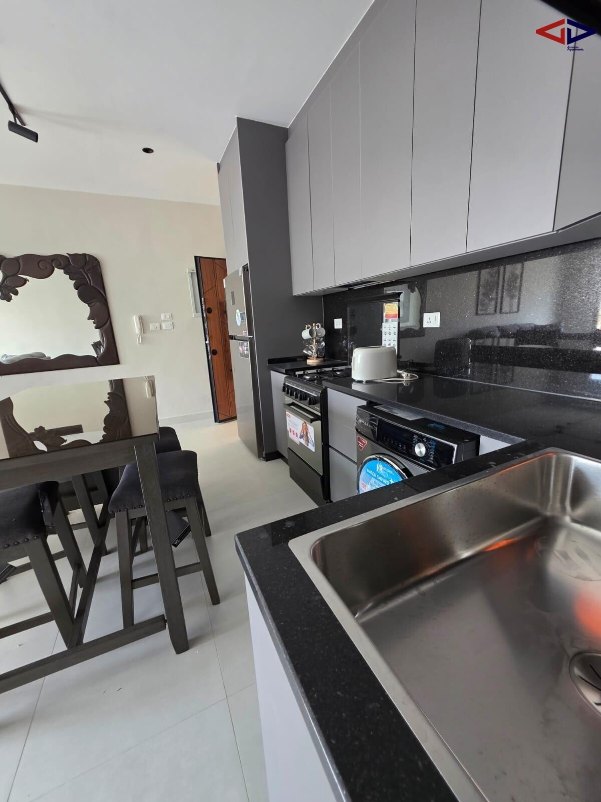 The apartment includes two comfortable bedrooms and two modern bathrooms finished with clean, contemporary touches. The bedrooms offer privacy and functionality, making the home both practical and welcoming.